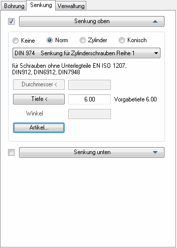 Erstellt eine zylindrische Senkung. Durchmesser und Senkungstiefe können frei definiert werden.