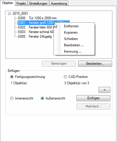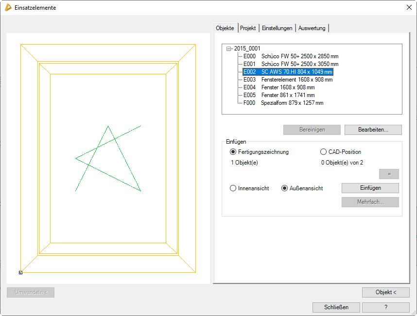 In einem Dialogfeld werden alle Einsatzelemente der Zeichnung angezeigt. Sie können diese als Fertigungszeichnung oder als CAD-Position in die Zeichnung einfügen. Weiterhin können Sie hier Projekteinstellungen ändern und Auswertungen der Einsatzelemente durchführen.