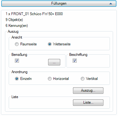 Bewirkt, dass Auszüge der Füllungen einzeln in die Zeichnung eingefügt werden oder das separate Fertigungszeichnungen erstellt werden. Beim Anklicken der Schaltfläche Auszug wird das Dialogfeld Auszug Füllung (auftragsbezogen) angezeigt. Weitere Informationen dazu finden Sie im Abschnitt Auszug Füllung.