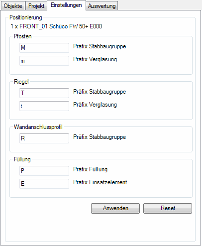 Hier definieren Sie die Präfixe für die Positionierung der verschiedenen Bestandteile der Einsatzelemente. Bei Fassadenelementen gibt es ein anderes Dialogbild als bei Fenster- und Türelementen. Der Präfix wird der Positionsnummer des jeweiligen Objektes vorangestellt.