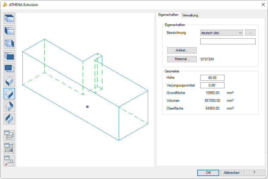 Sie können eine Extrusion speichern oder deren Eigenschaften ändern. Klicken Sie die Extrusion dazu doppelt an und führen Sie die gewünschten Optionen im Dialogfeld ATHENA Extrusion durch.