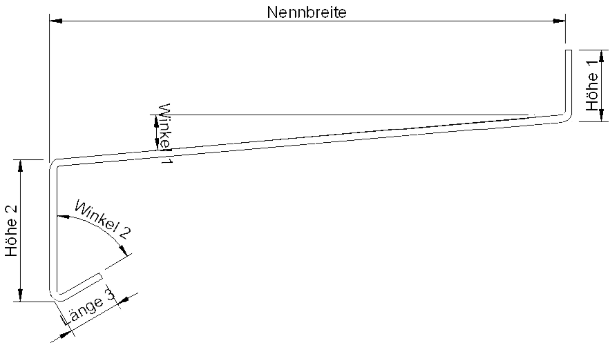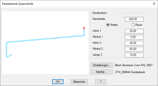 Mit dieser Funktion können Sie einen Blechquerschnitt in Form eines Blechfensterbankschnittes in der aktuellen Zeichnung erstellen.