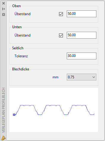 Solange die Eingabeaufforderung aktiv ist, wird die Palette Verlegeplan Profilblech angezeigt. Dort können Sie einige Eigenschaften anpassen, während Sie den Verlegeplan erstellen.