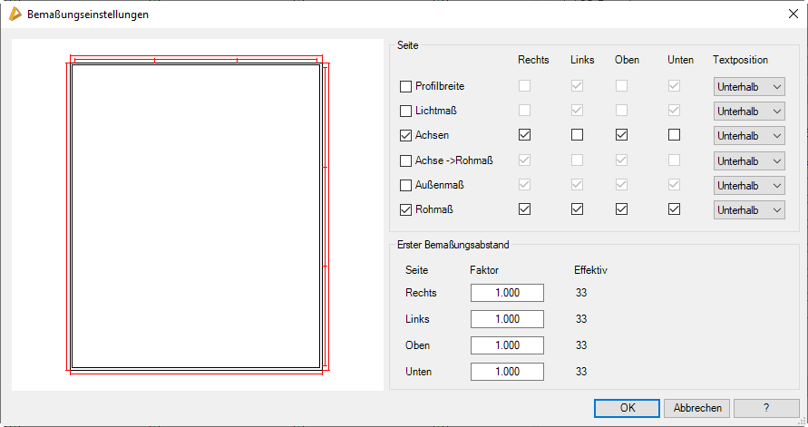 Rechts, Links wird für vertikale Maßketten (Riegelmaße) verwendet und Oben, Unten für horizontale Maßketten (Pfostenmaße).
