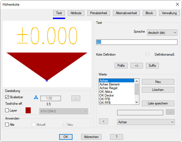 Ändert sowohl aktuelle (Schalter Aktuell ist immer aktiv) als auch neue Höhenkoten des Bemaßungssystems.