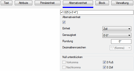 Unterdrückt die Angabe von Fuß bei Bemaßungen in Fuß und Zoll, wenn der Abstand kleiner als 1 Fuß ist. So wird beispielsweise 0'-6 1/2“ zu 6 1/2“.