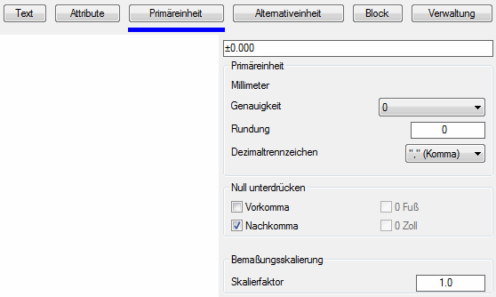 Aktuelle Einstellung: Kommastellen: 0, Maßstab: 1