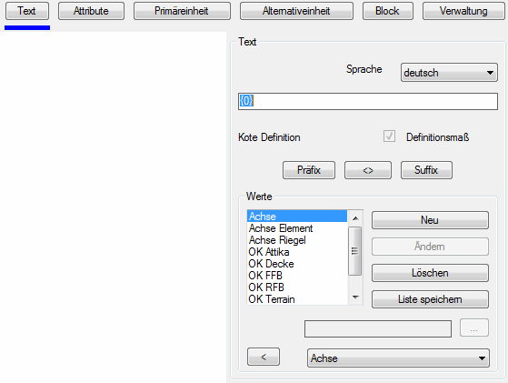 Zeigt die für das gewählte Objekt verfügbaren Maßtexte. Wählen Sie hier den Text zur weiteren Verwendung aus.