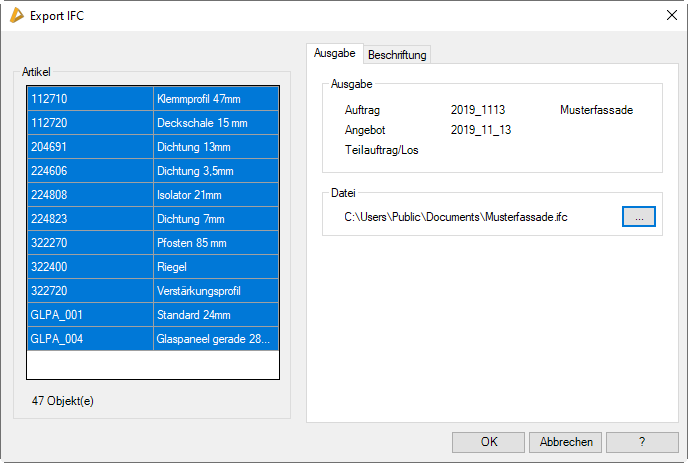 Wenn Sie das Dialogfeld mit OK schließen, wird die IFC-Datei im angegebenen Pfad gespeichert. Mit Abbrechen wird das Dialogfeld geschlossen und es wird keine IFC-Datei gespeichert.