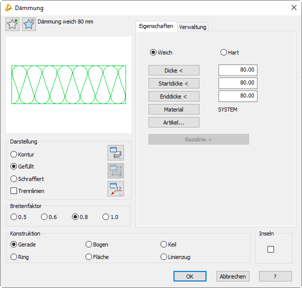 Erzeugt eine gefüllte Dämmung. Die Füllung ist abhängig von den Optionen Weich und Hart.
