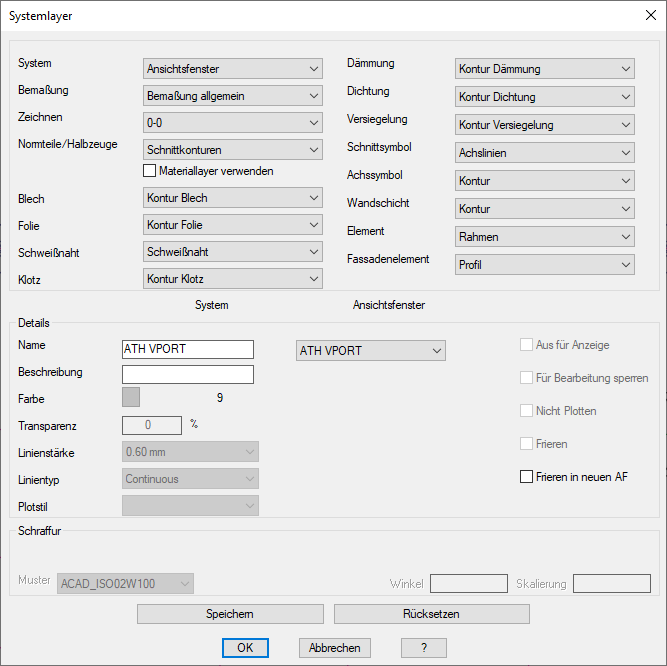 Hier verwalten Sie von ATHENA verwendete Systemlayer sowie die Layerzuordnung und Schraffurzuordnung zu den verschiedenen Objekten bzw. Objektbestandteilen.