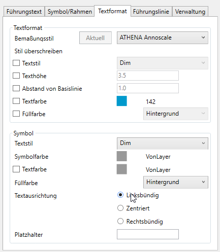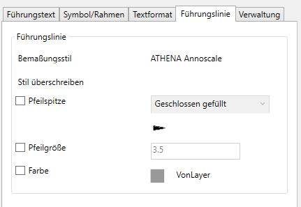 Für Führungstexte werden standardmäßig die Einstellungen des aktuellen Bemaßungsstils verwendet. Hier können Sie einzelne Stileinstellungen überschreiben.