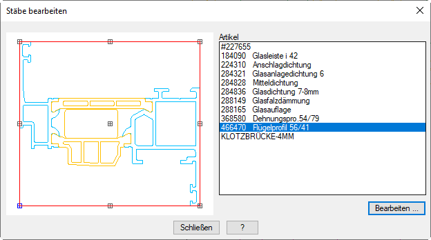 Wählen Sie hier einen Profilstab und drücken Sie die Schaltfläche Bearbeiten um den Stab im Dialogfeld Stabbaugruppen-Manager anzuzeigen. Dort können Sie die Zuschnittskontur des Profiles ändern.