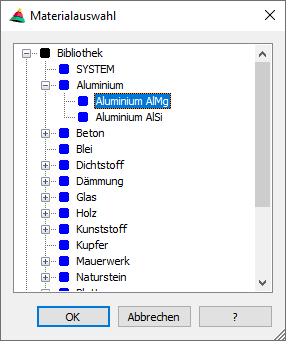 Im Dialogfeld werden die Materialien in einer Baumstruktur dargestellt. Klicken Sie das + an um einen Zweig zu öffnen. Klicken Sie das - an um einen Zweig zu schließen. Mit der Maus können Sie ein Material auswählen.