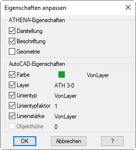 Im Bereich AutoCAD Eigenschaften, wählen Sie die AutoCAD spezifischen Eigenschaften aus, die Sie auf andere Objekte übertragen möchten. Diese Eigenschaften sind sowohl für AutoCAD- als auch ATHENA-Objekte gültig.