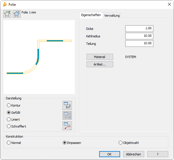Mit dieser Funktion erzeugen Sie Dichtungsfolien, welche sich ähnlich wie Polylinien mit Griffen oder durch Strecken verändern lassen. Sie können Folien mit verschiedenen Konstruktionsmöglichkeiten erzeugen.