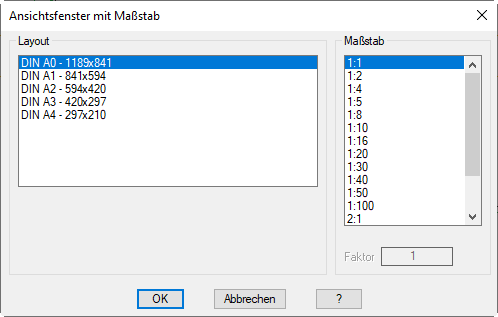 Mit diesem Befehl erzeugen Sie ein neues Ansichtsfenster mit Maßstab. Der Maßstab wird im Ansichtsfenster durch den Zoomfaktor eingestellt. Zu jedem neuen Ansichtsfenster erzeugt ATHENA einen eigenen maßstabsabhängigen Bemaßungslayer.