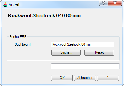 Öffnet die Artikeldatenbank und zeigt die nach Suchbegriff gefilterten Artikel an. Wählen Sie dort einen Artikel aus und Klicken Sie die Schaltfläche Artikel übernehmen an um dessen Artikelnummer in ATHENA zu verwenden. Weitere Informationen dazu entnehmen Sie bitte der E-R-Plus Dokumentation.
