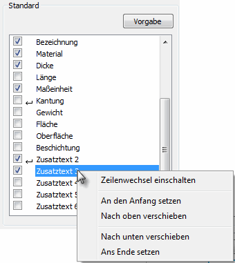 In der Liste werden die Beschriftungsbestandteile angezeigt, die für das aktive Objekt verfügbar sind. Mit dem Schalter können Sie einzelne Beschriftungsbestandteile ein- oder ausschalten und somit die Beschriftung an eigene Bedürfnisse anpassen. Ein Rechtsklick auf einen Beschriftungsbestandteil öffnet ein Kontextmenü, wo Sie weitere Beschriftungseinstellungen vornehmen können.