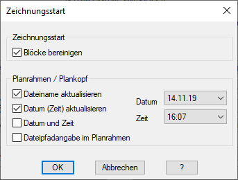Steuert Optionen des Zeichnungsstarts und das Aktualisieren des Plankopfes.