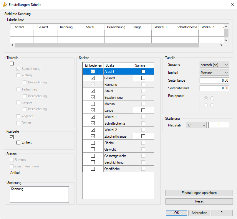 Legt Einstellungen für verschiedene Ausgabetabellen (beispielsweise Stücklisten wie Stabliste, Füllungsliste, usw.) fest. Sie können hier die Einheiten bestimmen und definieren, welche Zeilen und Spalten ausgegeben werden.