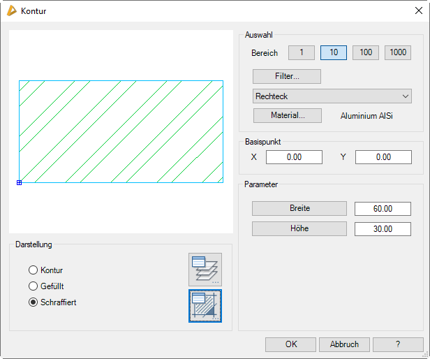 Dieses Dialogfeld wird auch von anderen Programmteilen aufgerufen. Daher ist es nicht immer zwingend die beschriebene Kontur in die Zeichnung einzufügen. Gegebenenfalls gelangen Sie zurück zum Ursprungsdialogfeld!