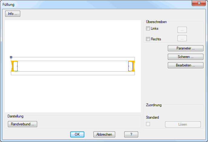 In diesem Dialogfeld können Sie verschiedene Eigenschaften eines eingefügten Füllungsschnittes ändern. Dieses Dialogfeld wird aktiviert wenn Sie eine Füllung in der Zeichnung doppelt anklicken.