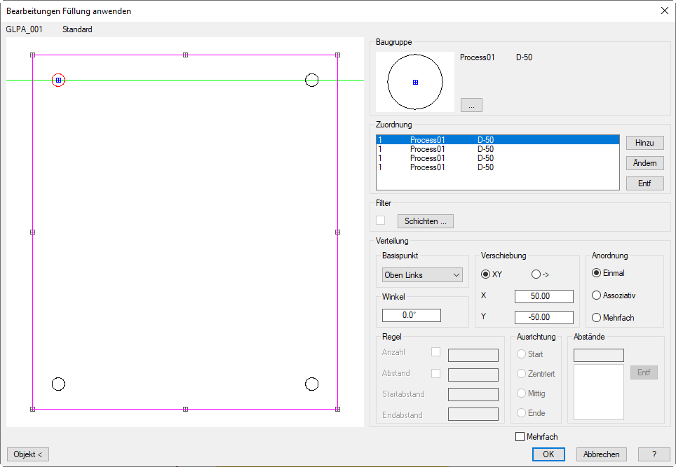Ordnet Bearbeitungen regelmäßig, entsprechend der definierten Verteilung, auf einer geraden Bearbeitungslinie der aktuellen Fläche an. Bei assoziativer Anordnung werden zusätzliche Dialogfeldbereiche freigegeben, in denen Sie die Verteilungsregeln festlegen können.