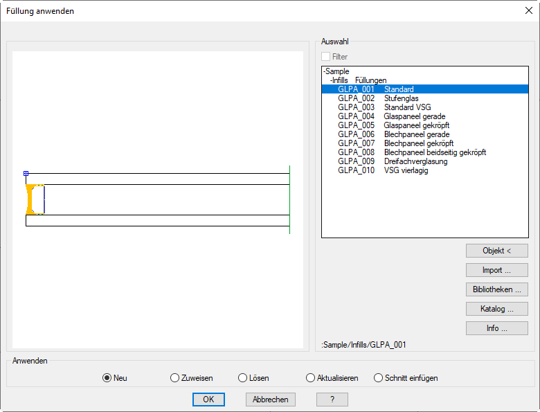 Mit dieser Routine können Sie Füllungen in der Zeichnung anwenden. Füllungen sind Gläser oder Paneele, sie können mehrere Schichten enthalten und sowohl zweidimensional als auch dreidimensional verwendet werden.