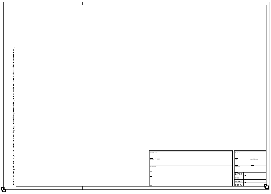 Mit diesem Befehl können Sie einen Planrahmen mit Schriftfeld in die Zeichnung einfügen. Zur Auswahl stehen Planrahmen in den Formaten DIN A4 bis DIN A0 (jeweils horizontal und vertikal) sowie drei verschiedene Schriftfelder. Sie haben die Möglichkeit auch eigene Planrahmen und Schriftfelder zu integrieren.