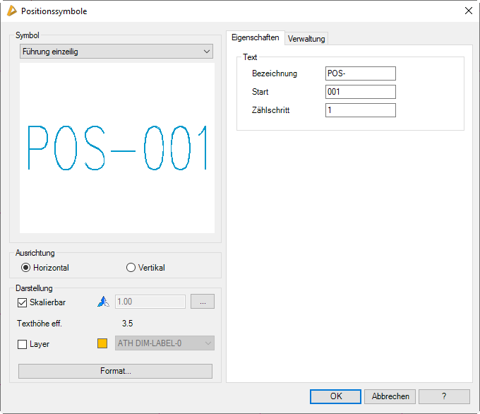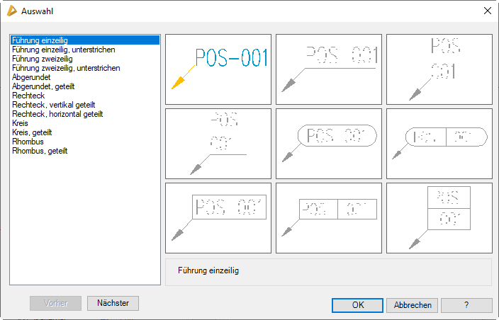 Mit dem Befehl Positionssymbole können Sie Symbole zur Nummerierung und Positionierung von Bauteilen in die Zeichnung einfügen. Das Hochzählen der Positionsnummern erfolgt automatisch, wobei die Zählschritte von Ihnen festgelegt werden.