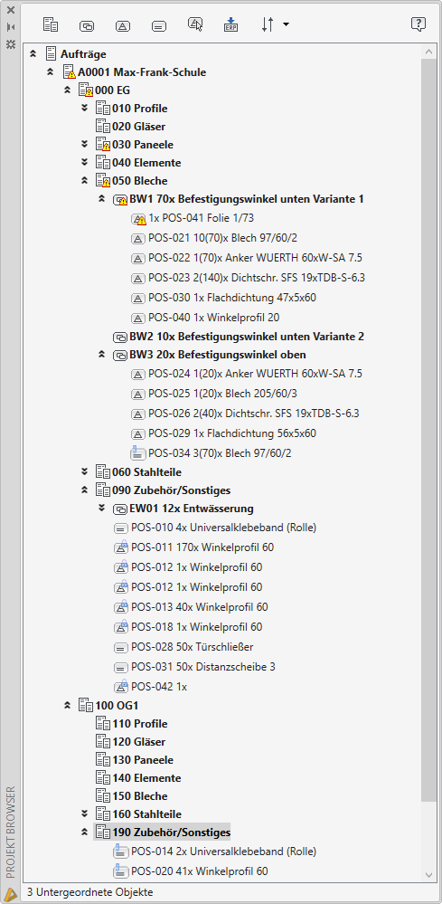 Der Auftrag ist der erste Knoten in der Baumstruktur des Projektbrowsers. Ein Auftrag kann Teilaufträge sowie Gruppen und Positionen enthalten.