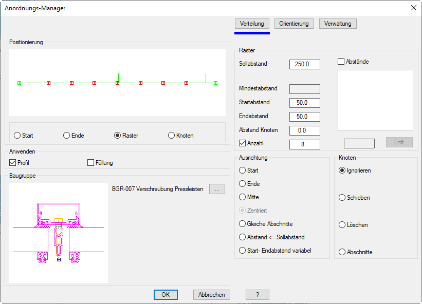 Auf der linken Seite des Dialogfeldes sehen Sie den allgemeinen Darstellungsbereich mit einer Vorschau der Baugruppenanordnung. Rechts gibt es den Bedienbereich mit den Registerschaltflächen Verteilung, Orientierung und Verwaltung.