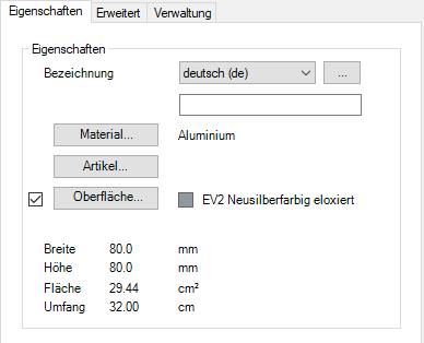 Im Dialogfeld finden Sie auf der linken Seite den Darstellungsbereich mit der dynamischen Vorschau. Auf der rechten Seite sehen Sie den Bedienbereich mit den Registerkarten Eigenschaften, Erweitert und Verwaltung.