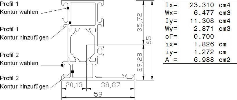 Mit diesem Befehl können Sie Schwerpunkte und statische Momente eines einzelnen Profils oder mehrerer zusammengesetzter Profile berechnen. Bei zusammengesetzten Profilen müssen Sie zur Bestimmung der Verbindungsqualität einen Verbundbeiwert angeben.
