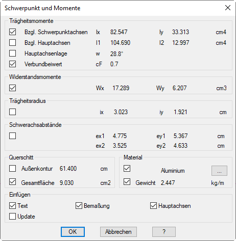 Dialogfeld Schwerpunkt und Momente