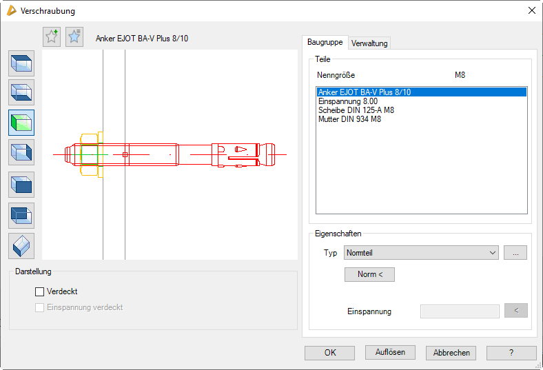 Mit diesem Befehl können Sie Verschraubungen erstellen, bearbeiten und speichern. Verschraubungen können in verschiedenen 2D-Ansichten oder als 3D-Objekt eingefügt und verwendet werden.