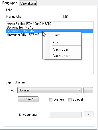 Zeigt die Bestandteile der aktuellen Verschraubung an. Über der Liste wird das Nennmaß der Verschraubung angezeigt (z.B. M12). Das erste Bauteil der Liste definiert das Nennmaß der gesamten Verschraubung und sollte eine Schraube sein, auf die weitere Bauteile “aufgefädelt“ werden. Sie können in der Liste ein Teil der Verschraubung selektieren um dessen Eigenschaften zu ändern.