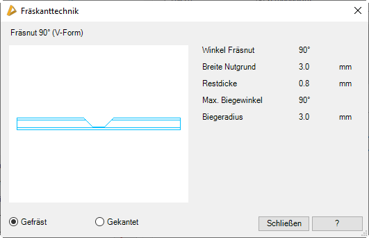 In diesem Unterdialogfeld werden Informationen zu Fräsnuten, welche für die Kantung von Verbundplatten erforderlich sind, angezeigt.