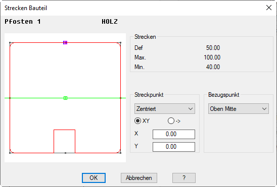 Der Bezugspunkt gibt den Punkt an, von dem aus die Skalierung wirken soll. Die Voreinstellung Oben mitte bewirkt zum Beispiel, dass dieses Bauteil am Festpunkt verankert ist und in Y-Richtung nach unten gestreckt wird. Die erforderliche Position des Streckpunktes kann aus dem Pulldown Menü gewählt werden.