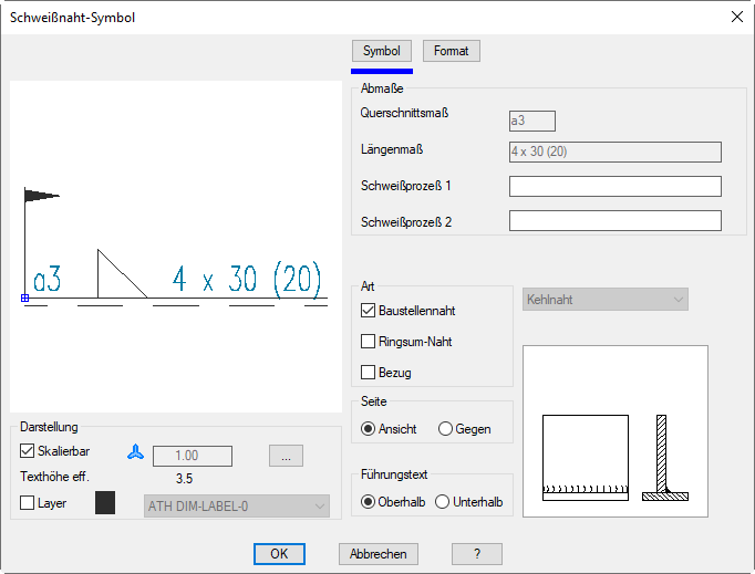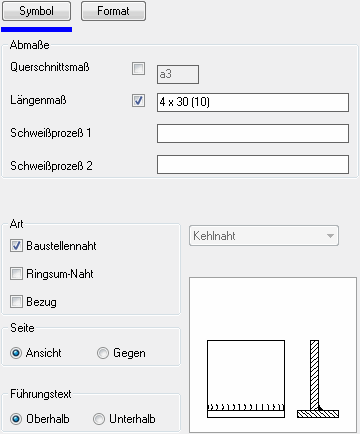 Der Darstellungsbereich zeigt eine schematische Vorschau auf das gegenwärtige Schweißnahtsymbol an.