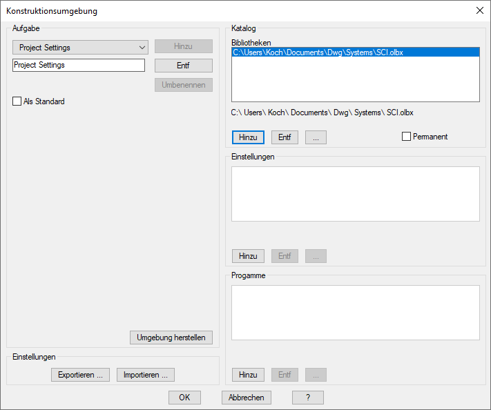 Dialogfeld Konstruktionsumgebung