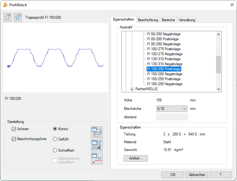 Mit diesem Befehl können Sie Profilbleche (Trapez- oder Wellbleche) erstellen. Es stehen verschiedene Hersteller und deren Produkte zur Auswahl.