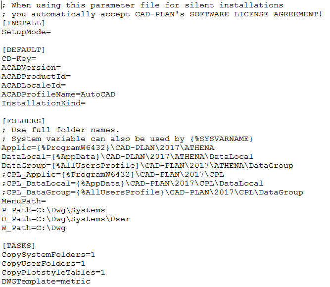 CPL_DataGroup= Ordner für Gruppeneinstellungen der CAD-PLAN Applikation, Vorgabe: {%AllUsersProfile}\CAD-PLAN\2021\CPL\DataGroup