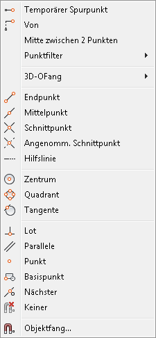 Wenn die Tastenkombination Strg + Rechte Maustaste gedrückt wird, öffnet sich das Objektfang Kontextmenü neben dem Fadenkreuz und eine der Objektfang Methoden kann gewählt werden.