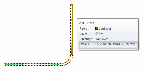 Wenn Sie die Maus über ein ATHENA Objekt bewegen, werden in den Quickinfos entsprechende Details angezeigt. Das sind neben den AutoCAD Eigenschaften (Farbe, Layer, Linientyp) auch die spezifischen Eigenschaften des jeweiligen ATHENA Objektes (z.B. Folie EPDM 1.2/200 mm).