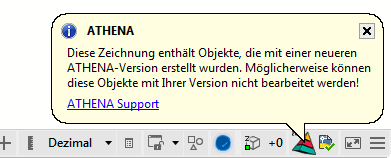 Ab der Version ATHENA 2015 erscheint eine Information in Form einer Sprechblase, wenn Sie eine Zeichnung öffnen, die Objekte aus einer neueren ATHENA Version enthält.