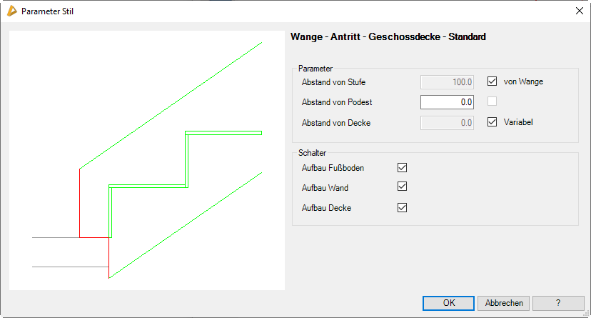 Die Wangenunterkante wird spitz ausgebildet. Der Abstand zur Decke wird von anderen Parametern (z.B. Abstand von Podest) beeinflusst.