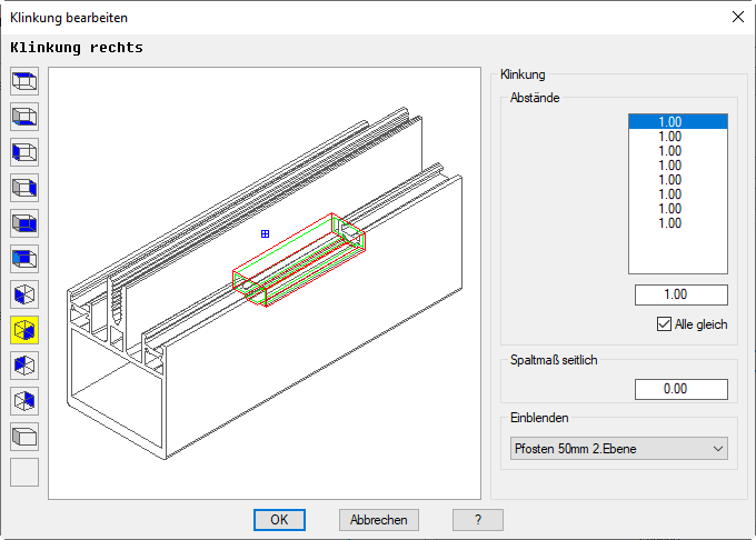 Listet die Abstände für jede Seite der Klinkung auf. Die zum markierten Wert gehörende Seite wird in der Ansicht von vorne mit einem x gekennzeichnet.