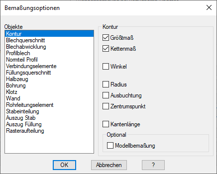 Auf der linken Seite befindet sich die Liste der Objekte, die automatisch bemaßt werden können. Wählen Sie hier ein Objekt, um die dessen Bemaßungseinstellungen zu ändern. Die für das gewählte Objekt möglichen Bemaßungsoptionen werden auf der rechten Seite des Dialogfeldes angezeigt.
